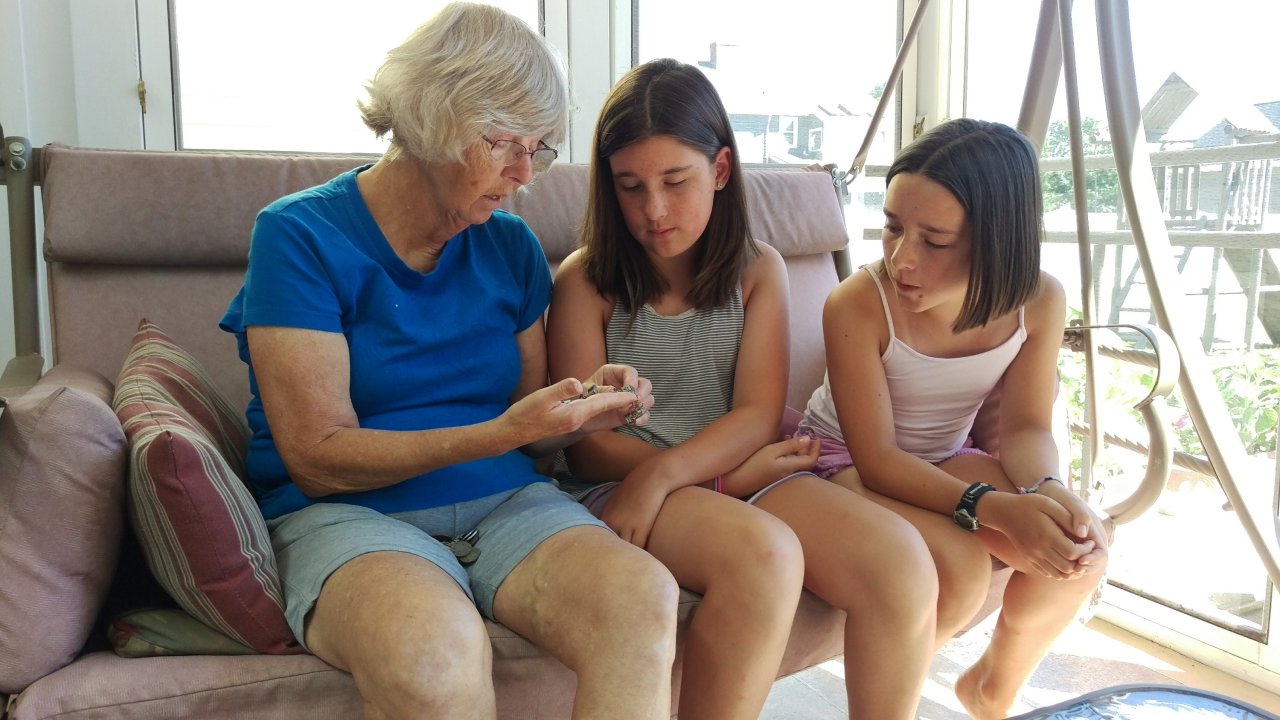 My mom showing the girls her bracelets with charms and coins from around the world that she collected when she traveled as a girl in a miltary family. When I was little, they were my favorite things to look at in her jewlery box.