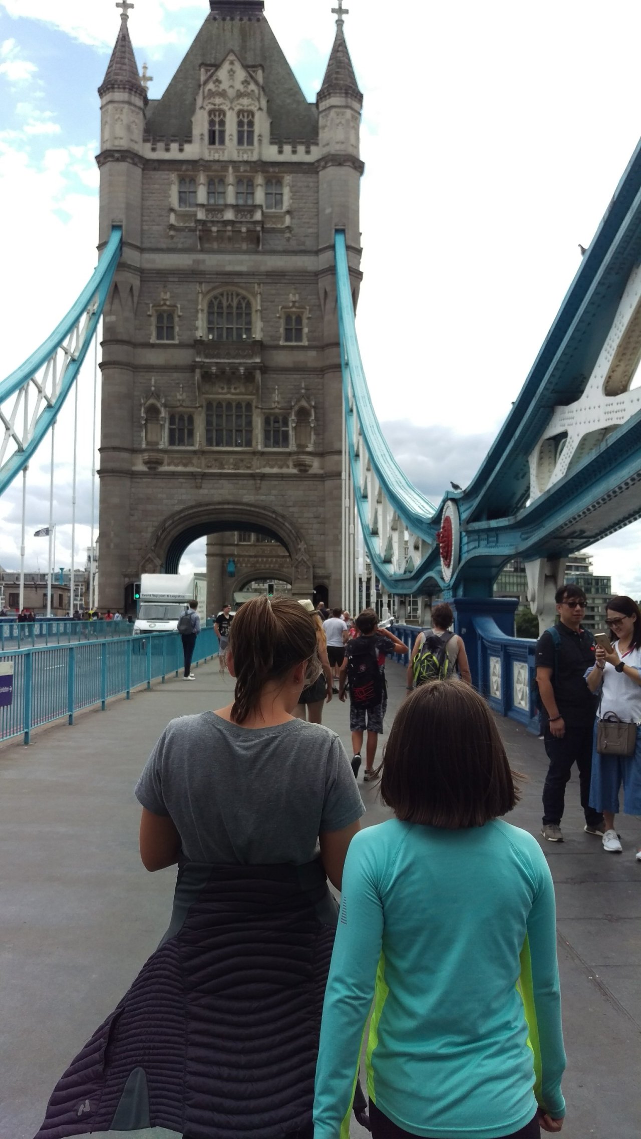 We went to Tower Bridge and got to walk on the very tippety top. It has pieces of glass on the bottom so you could look all the way down. It was really cool but also very scary.