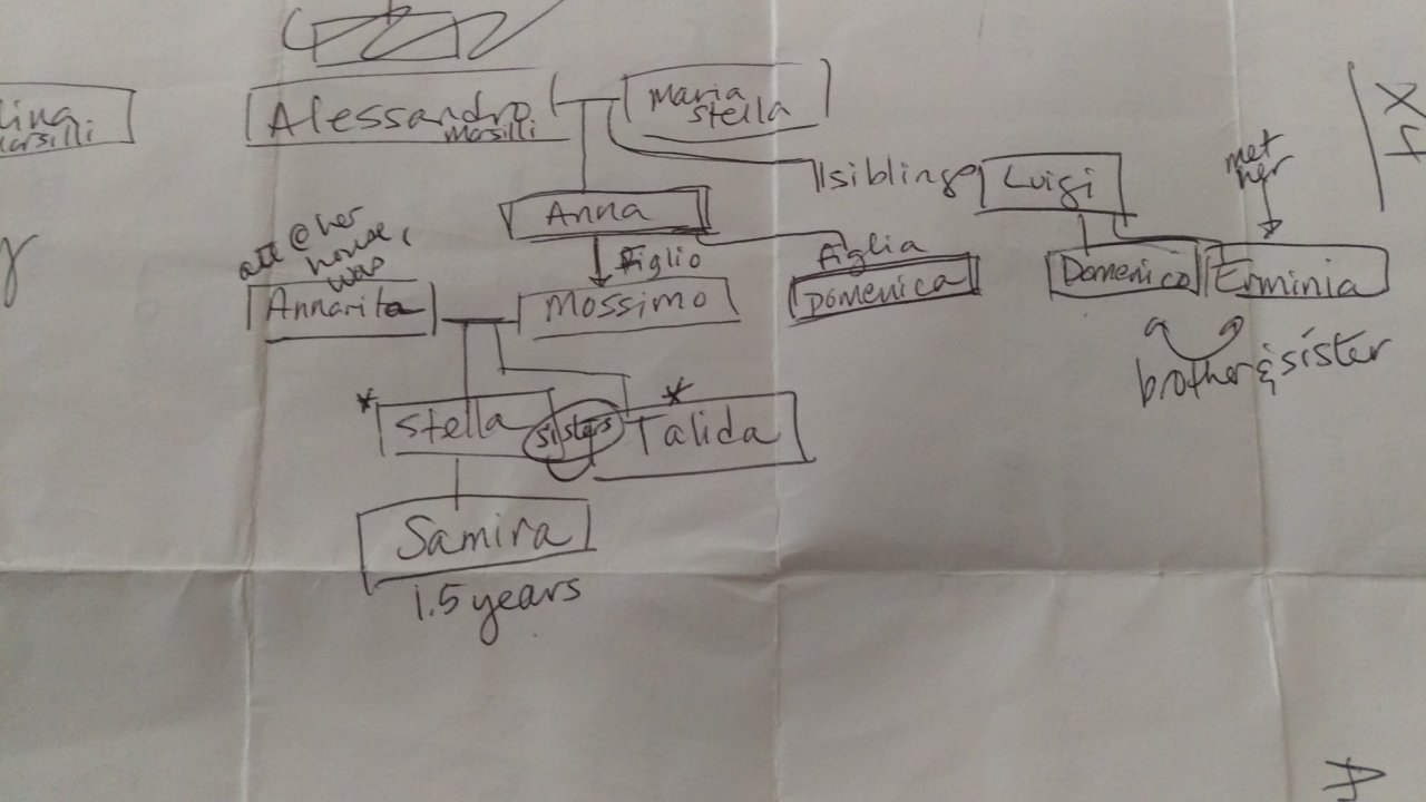 When we arrived I recognized Nini’s old house – where the family still lives- from photos and descriptions my parents relayed after their visit in 2007. Inside, the smell struck me as so familiar to that of Nini’s family building we would regularly visit in the North End when I was a kid. We met cousin Mossimo, his sister Domenica, Anna Rita’s parents from Abruzzo, and cousin Talida, Stella’s sister. We continued to use Translator for conversation as I mapped out the family connections of everyone we were meeting on a piece of scrap paper.